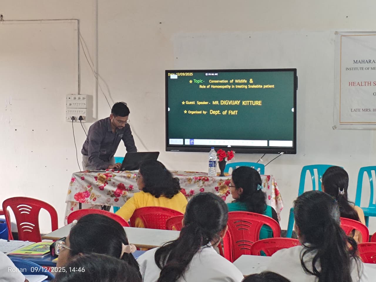 A guest lecture by Mr. Digvijay Kitture on “Conservation of Wildlife and Role of Homoeopathy in Treating Snake Bite Venom” was organized on 12th September 2025 at Late Mrs. Housabai Homoeopathic Medical College and Hospital, Nimshirgaon. The speaker highlighted the importance of protecting wildlife and explained homoeopathic approaches in managing snake venom